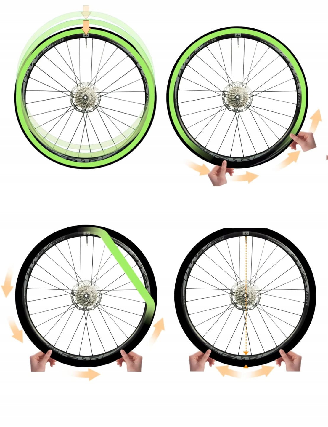 - Zaczynając od przeciwnej strony niż zawór (jak pokazano), umieszczaj oponę na feldze równomiernie z obu stron jednocześnie.
